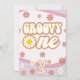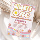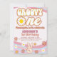 Retro style first birthday invitation for a little girl featuring a decorative retro font heading, some daisies, and peace sign on a pink and blue background. This groovy one girl's 1st birthday invitation is ideal for a 60's or retro themed first birthday party.