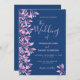 A floral trendy wedding invitation in blue and pink A modern blue background decorated with botanical pink coloured sprigs and foliage. Modern large handlettered script, typography with the text: The wedding of. Personalise and add your names and wedding details. Pink text.