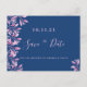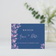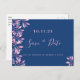 An elegant and trendy wedding Save the Date card. Blue background and golden text on front. Decorated with pink coloured botanical florals and foliage. Save the Date is written with a modern hand lettered style script. Templates for the wedding date and your text.