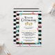 Cute naming ceremony invitation for twin siblings with footprints in gold, pink, and blue scattered over a black and white striped background. Naming ceremony is written in a charming script. Add your twins' names and the details of the naming ceremony.