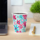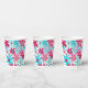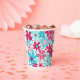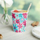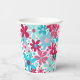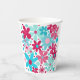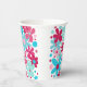 Funky blue & pink flowers with blue & pink polka dots on white background paper cups.