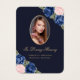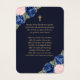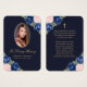Beautiful blue and gold floral memory card/funeral prayer card featuring a photo adorned with pink and blue roses and baby's breath flowers on a dark blue background.