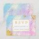 Blue and pink watercolor, gold foil confetti and specks wedding RSVP response card.
