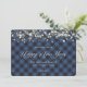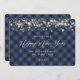 Blue buffalo plaid New Year card featuring glowing lights and stars on a blue and black buffalo plaid background. Easily personalise this minimalist holiday card online.