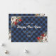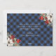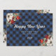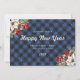 Elegant blue buffalo plaid New Year card featuring a watercolor painting of poinsettia, holly and red berries along with falling snow on a blue buffalo plaid background.