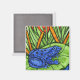 Image is my original acrylic painting. This vibrant blue poison frog with black spots is sitting on a bright green lilly pad in the water with green grass and yellow rods behind him. The background sky is vibrant orange. See my store Art by MAR for matching products with this design.