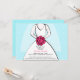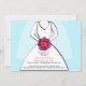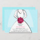 This invitation is designed for a 5x7 card and features a Blue background with small, subtle white polka dots, a bride figure carrying bright pink flowers, and space for fully customised text on both the front and back.