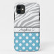 Custom iPhone 5 case personalised with your name, and designed with a blue & white polka dot pattern and a faded zebra print pattern with grey & white zebra stripes.