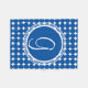 Blue dots in close quarters create a secondary pattern of white stars. A large blue circle is surrounded by white lines, while a single white initial graces the centre.