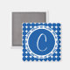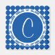 Blue dots in close quarters create a secondary pattern of white stars. A large blue circle is surrounded by white lines, while a single white initial graces the centre.
