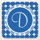 Blue dots in close quarters create a secondary pattern of white stars. A large blue circle is surrounded by white lines, while a single white initial graces the centre.