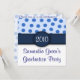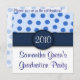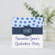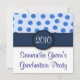 These adorable invitations are light blue on the upper half with medium blue polka dots. The bottom of the invitation is solid white with navy blue font. The upper and lower halves are divided by a solid navy blue band with a navy blue circle where you can add your own text, either a graduation year, monogrammed initial, etc. The reverse side of these invitations is a muted light blue with med. blue polka dots and navy blue font. Text can be customised to suit your needs. These invitations are perfect for graduations, baby showers, birthdays, housewarming parties and so much more. The example shows invitation being used for a graduation party. Celebrate in style with these Blue Polka Dot Party Invitations!