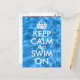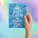 Customisable "Keep Calm and Swim On" with white text against tinted photo of blue swimming pool water.