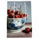 A classic blue-and-white porcelain bowl brims with glossy red cherries, each one painted with meticulous realism and soft natural light. The contrast between the cool ceramic and the rich, ripe fruit creates a sense of freshness, abundance, and timeless calm.