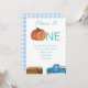 1st birthday pumpkin invitation with blue truck and blue plaid design, easy to edit text.