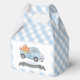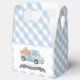 This cute vintage, and rustic boy's baby shower favour box features a white background with baby blue gingham checks and a blue truck filled with pumpkins and flowers. Personalise for your needs. You can find more matching products at my store.