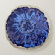 Brilliant blue with accents of purple burst forth from a silver background in this image. The round pillow is the perfect backdrop for this painting.