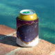 Can cooler with an abstract design with blue and purple layers with faux gold foil ribbons in between.