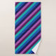 A bath towel featuring a colourful pattern design of diagonal stripes in cool teal, ocean blue, navy blue, plum purple, and lavender.