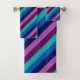 A set of bath towels featuring a colourful pattern design of diagonal stripes in cool teal, ocean blue, navy blue, plum purple, and lavender.