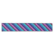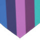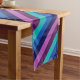 A 16” x 108” table runner featuring a colourful pattern design of diagonal stripes in cool teal, ocean blue, navy blue, plum purple, and lavender.