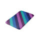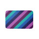 A small sized bath mat featuring a colourful pattern design of diagonal stripes in cool teal, ocean blue, navy blue, plum purple, and lavender.