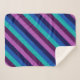A small sized sherpa blanket featuring a colourful pattern design of diagonal stripes in cool teal, ocean blue, navy blue, plum purple, and lavender.