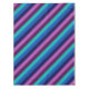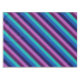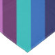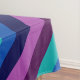 A 52” x 70” tablecloth featuring a colourful pattern design of diagonal stripes in cool teal, ocean blue, navy blue, plum purple, and lavender.