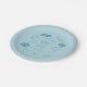 Quirky and fun graduation party plate featuring hand drawn illustration of funky academic icons. Background is blue.