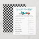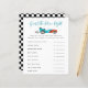 Race car theme baby shower game card featuring watercolor illustration of a blue vintage car with red flame art. The texts are editable. Perfect game to play during the shower. It lists baby essentials and asks guests to guess the price. Whoever guesses the price the closest wins!