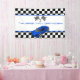 This custom banner features a blue sports car with black and white chequered racing flags and background. Sample text is easy to change to your own. Additional text can be added, and font styles, colours and more can be adjusted by using the design tool. Matching party items are available in my store. Be sure to follow me for new product updates. Thank you for your interest in SapphireDesigns!