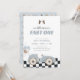 This editable blue vintage race car 1st birthday party invitation sets the tone for your fast one birthday celebration. The JAVIN Collection features a fun design with a white background and a light blue vintage race car with balloons tied to the back the blue vintage race car birthday invitation. A combo of script and racing & sans serif fonts in washed black and blue with all editable text completes this boy 1st race car party invite.
