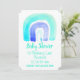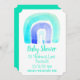 A cute invitations design of blue rainbow watercolor art to symbolise a baby boy for a baby shower invitation. Colour theme of blue, aqua and white. Simple and beautiful.