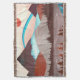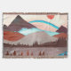 Mountain landscape scene in reds and blues with a lake and a bold blue rainbow.