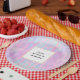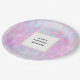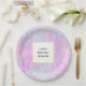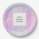 Birthday paper plates with an abstract background pattern. Pink purple and blue watercolors make up this artistic design which features vertical rectangle shapes on a soft mottled background. A square layered over top with a faux gold foil border, your personalised text inside.