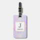 A luggage tag with an abstract background pattern. Pink purple and blue watercolors make up this artistic design which features vertical rectangle shapes on a soft mottled background. A square layered over top with a faux gold foil border, your personalised text inside.