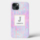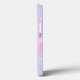 A phone case with an abstract background pattern. Pink purple and blue watercolors make up this artistic design which features vertical rectangle shapes on a soft mottled background. A square layered over top with a faux gold foil border, your personalised text inside.