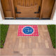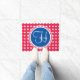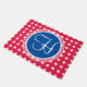 Red dots in close quarters create a secondary pattern of white stars. A large blue circle is surrounded by white lines, while a single white initial graces the centre.
