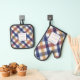 Blue, red, gold and white plaid pattern on these one of a kind oven mitts and pot holders