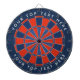 Blue, red dartboard with custom text.