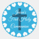 Blue religious cross boy's first holy communion stickers. Elegant round stickers with love heart symbol and stylish script typography template. Custom party favour sealers for Christian faith. Add your own name. Use this design for 1st holy communion of baby boy or girl, baptism, christening, confirmation etc. Modern Christianity symbol for Jesus Christ / God. Custom envelope seals for kids, son, grandson, friends, family, church pastor, priest, Catholic, Baptist, Lutheran, Evangelical, Methodist Protestant and other religions.