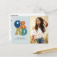 This fun graduation postcard has a modern take on vintage 1970s design. The front of the card includes 70s lettering on the left and a vertical photo on the right. The retro typography reads "Grad" in shades of navy blue, burnt orange, harvest gold, and aquamarine green against a light blue background. The graduate's name and school are written below the typography, and the graduation year is written across the D in "Grad". On the back, you can add a message to recipients and/or graduation party information.