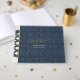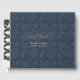 Dark blue wedding guest sign in book with a blue on blue floral pattern and a blue ribbon and metal rivet looking binding. Gold tone graphic text reads Guest Book. Personalise the custom text to suit your wedding needs. Lovely keepsake.
