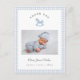 Cute and simple Blue and white baby boy Birth announcement postcard with photo with gingham border and a modern rocking horse silhouette.
