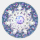 Snowflake with my drawing of a stained glass window from an old European church: a rose window, with touches of a wide variety of colours, including shades of blue, on a navy blue background. Inlay of light blue rhinestones (drawn). For an old times winter pattern. This motif is also available in cardinal red in my “cardinal red rosace” collections.
