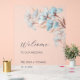 This elegant wedding welcome board features layered dimensional blue and gold flowers on a transparent background.