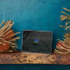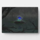 A dark, still pond surrounded by leafless trees. On a rock in the middle of the water, a single, glowing, blue rose.