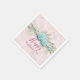 Happy Mother's Day paper napkins with a photo of blue roses surrounded by sprigs and leaves and fancy baubles. The baubles also form a crown shape. White flowers and pretty blue bows and white lacy ribbon also surround the roses. Set on a dusty pink marble background.