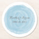 Trendy and stylish Watercolor Wedding Paper Coasters with a circle brushed watercolor look blue background. These elegant and modern coasters are easy to customise with your wedding details. For more customisation options, click on the Customise It button.