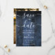 This elegant blue rustic barn wood boho wedding save-the-date card can be personalised with your information in chic typography and a special photo on the reverse. Designed by Thisisnotme©
